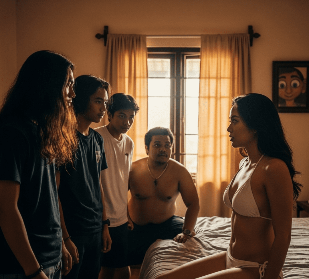 Di sana aku mencuci mukaku dari cipratan sperma agar aroma yang menyengat itu hilang. Keluar dari kamar mandi, kembali aku duduk di kasur dikelilingi mereka. Sudah tanggung untuk dihentikan, jadi kuikuti saja deh permainan mereka. Kali ini si Cecep yang masih hijau itu minta diajari ciuman.